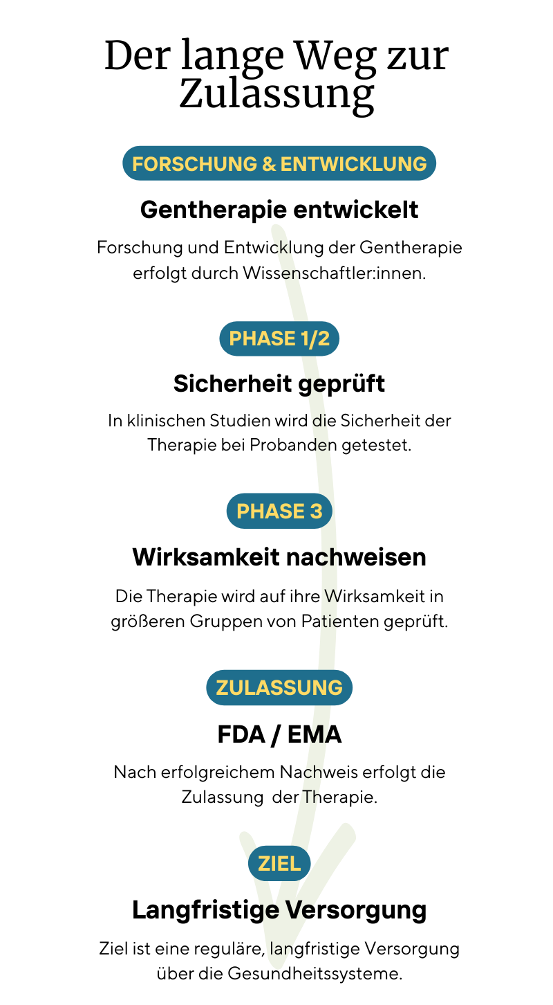 Das bedeutet: Auch in Europa ist der Zugang zur Therapie derzeit ausschließlich über Studien möglich – und die verfügbaren Studienplätze sind extrem begrenzt.